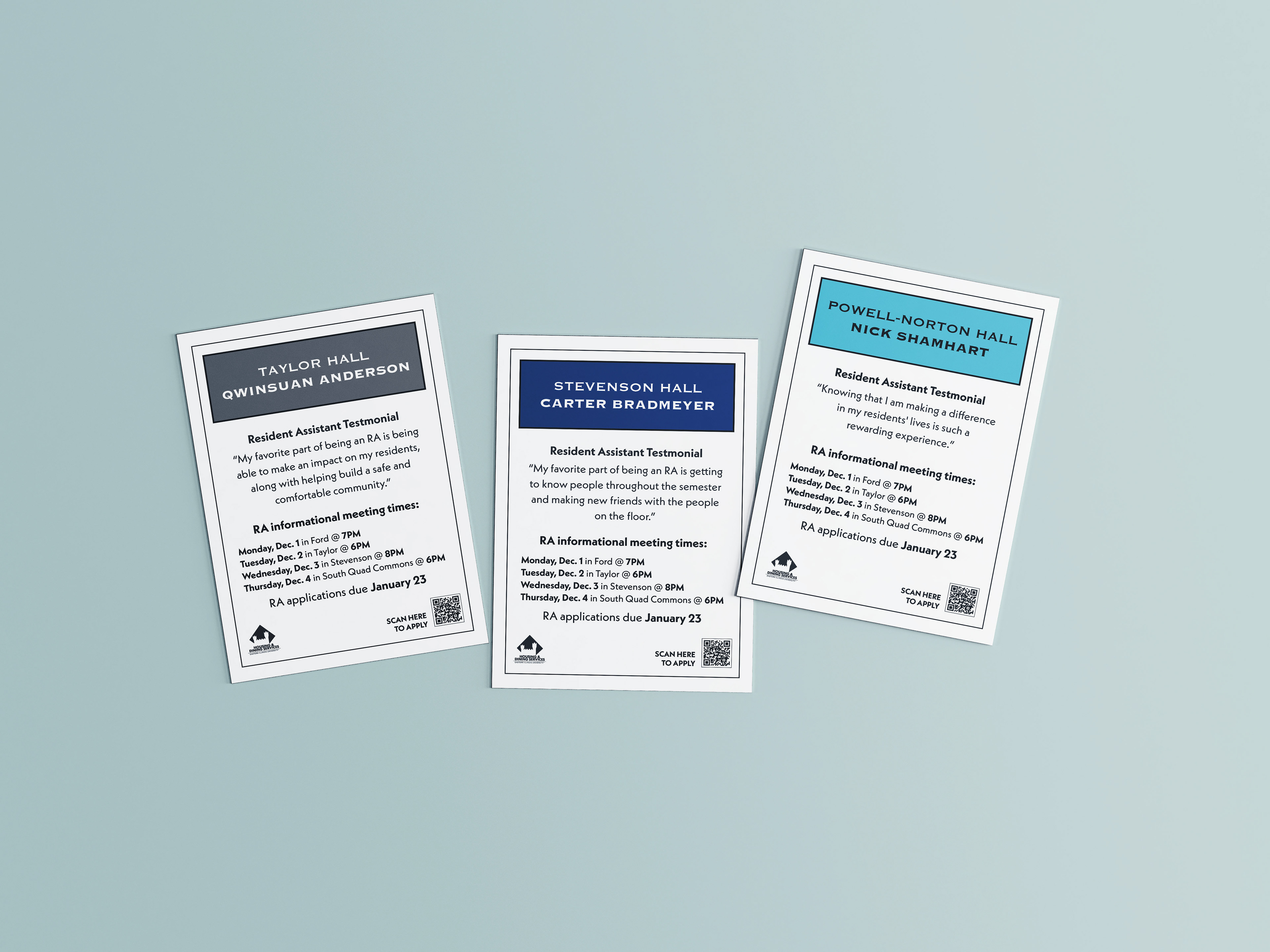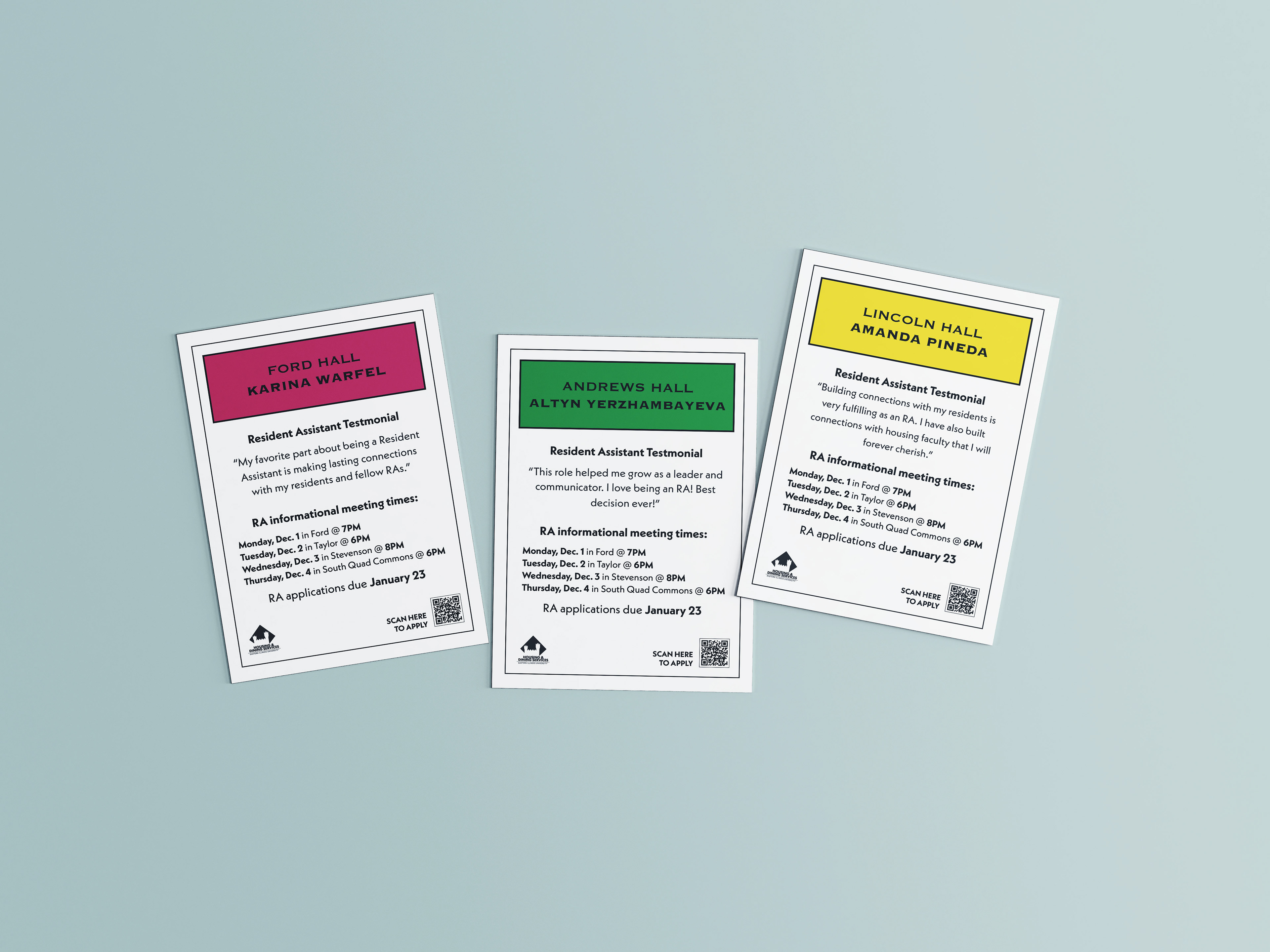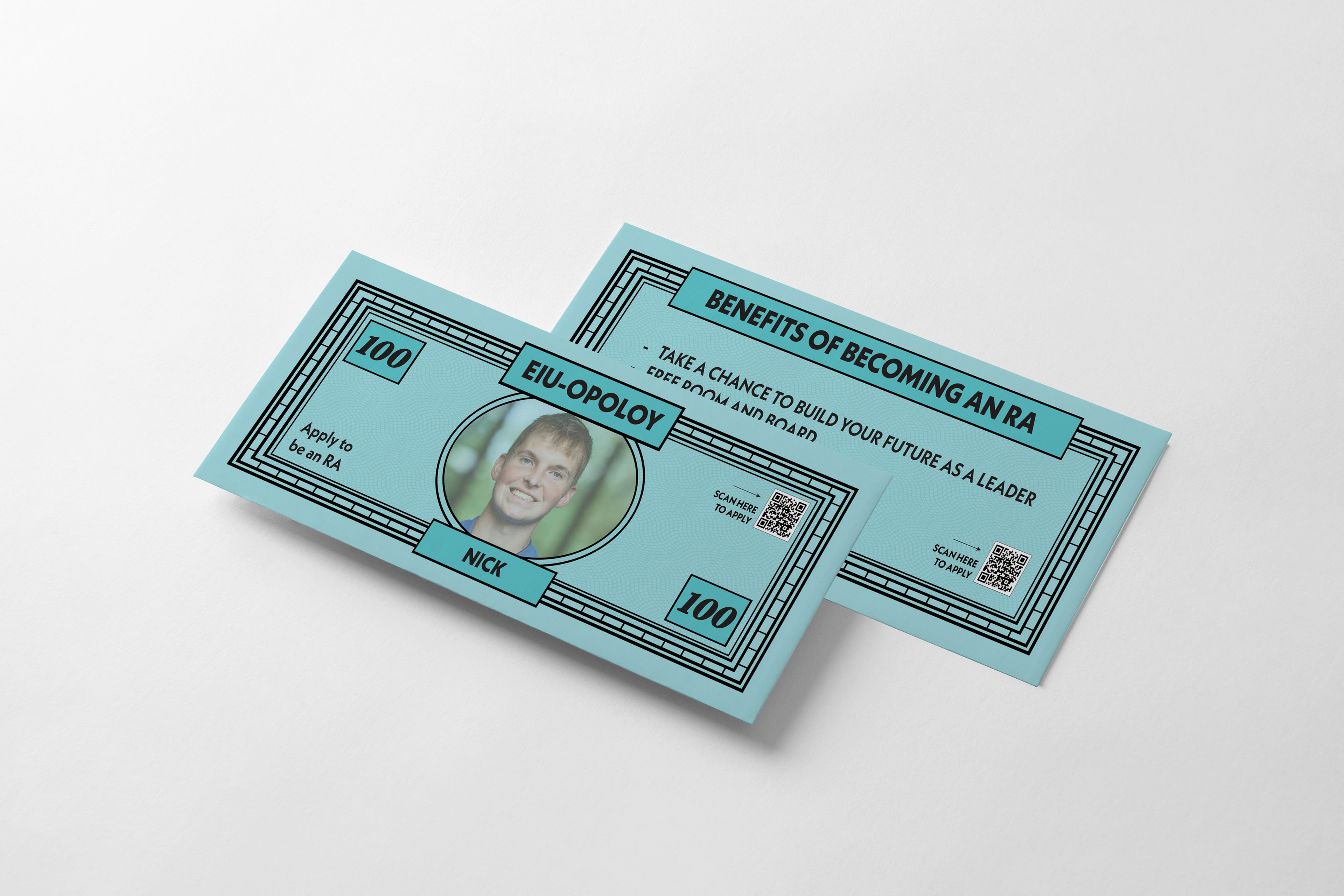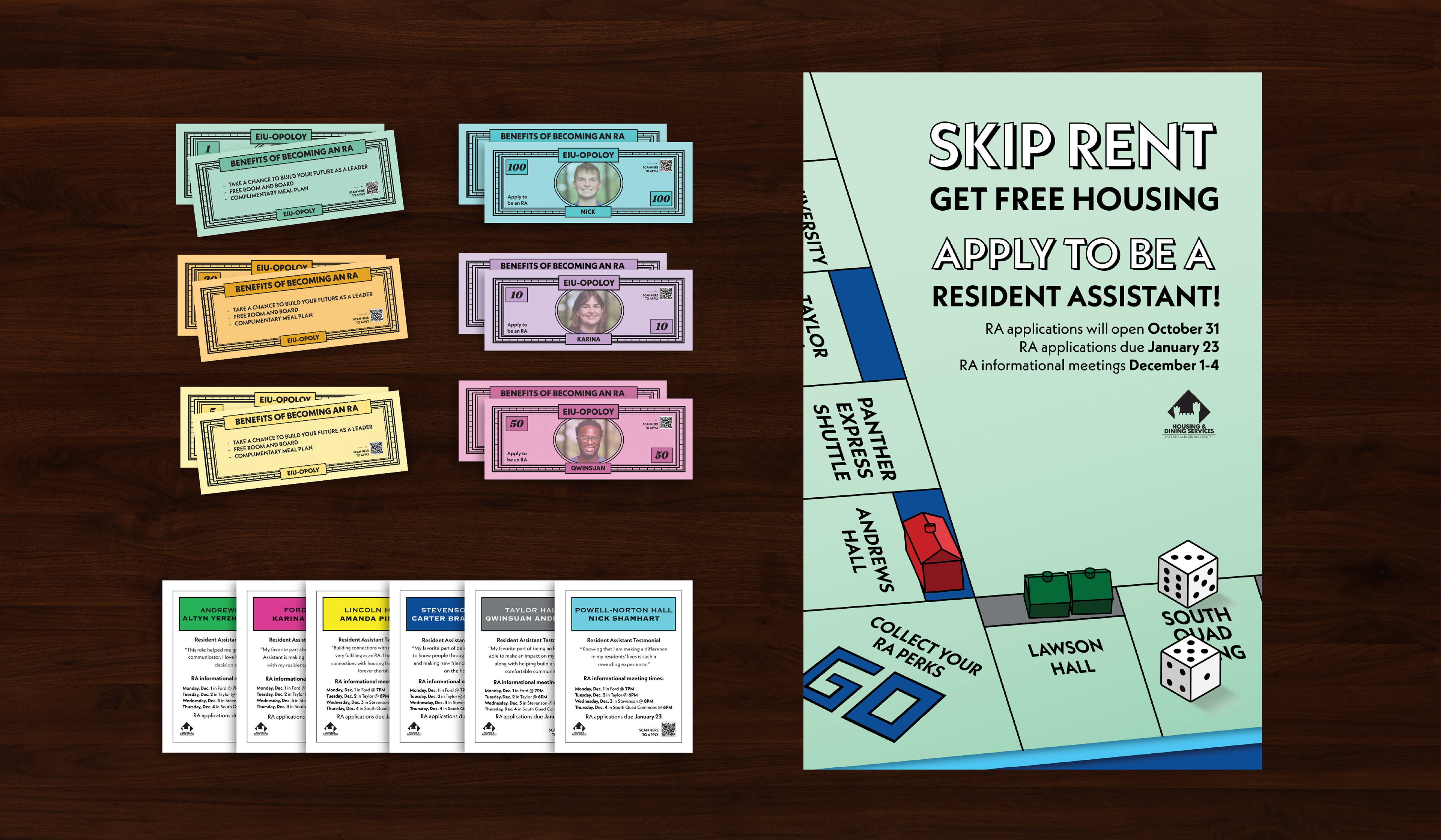 Overview: Develop a visual campaign that fits a Monopoly-inspired game theme to promote the Resident Assistant recruitment for EIU’s Housing & Dining department. Solution: Designed a Monopoly-inspired game board featuring EIU specific locations to make the piece feel campus-focused and cohesive. Supporting pieces were created, including paper money and postcards styled as game cards reinforce the theme across all print and digital materials.
