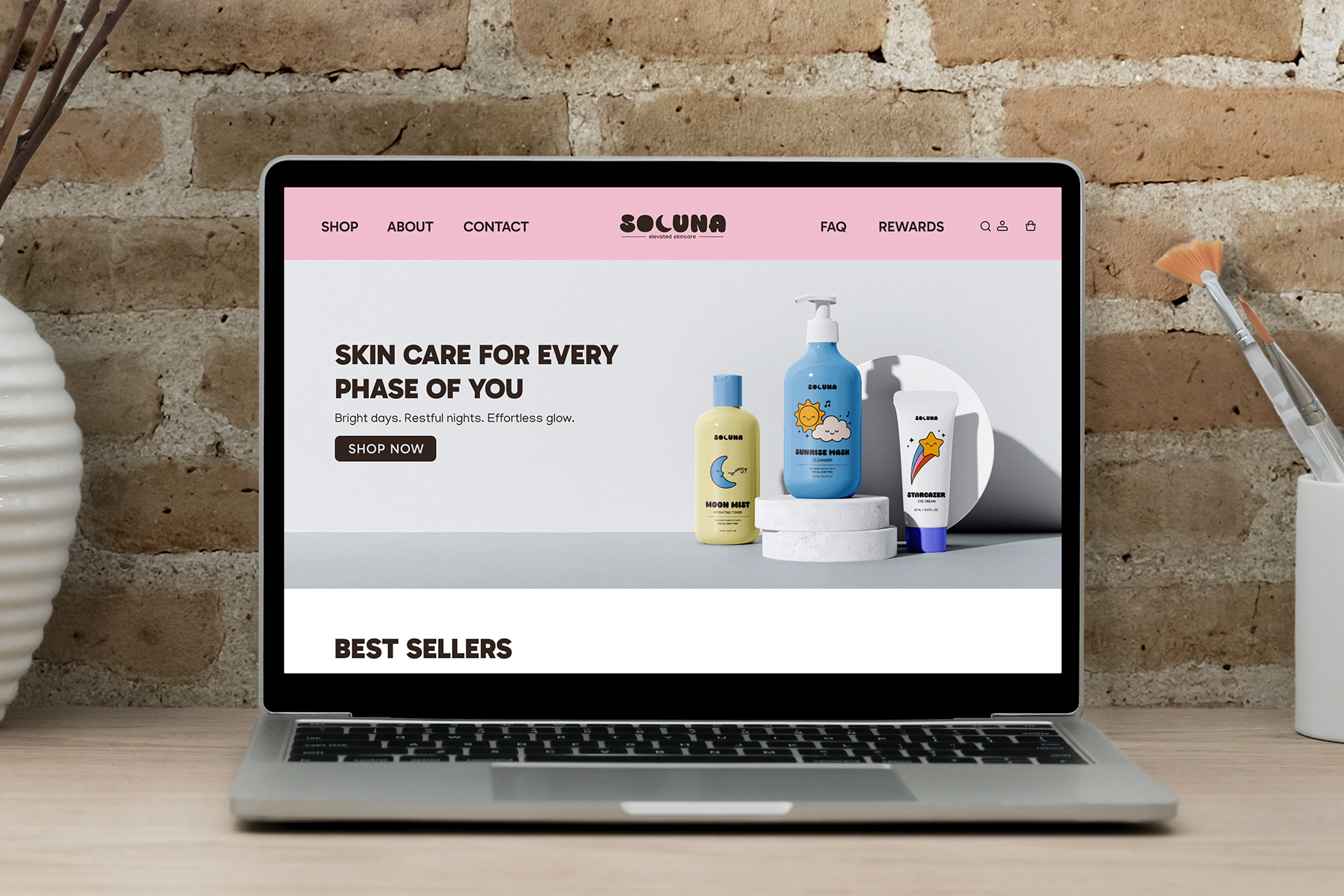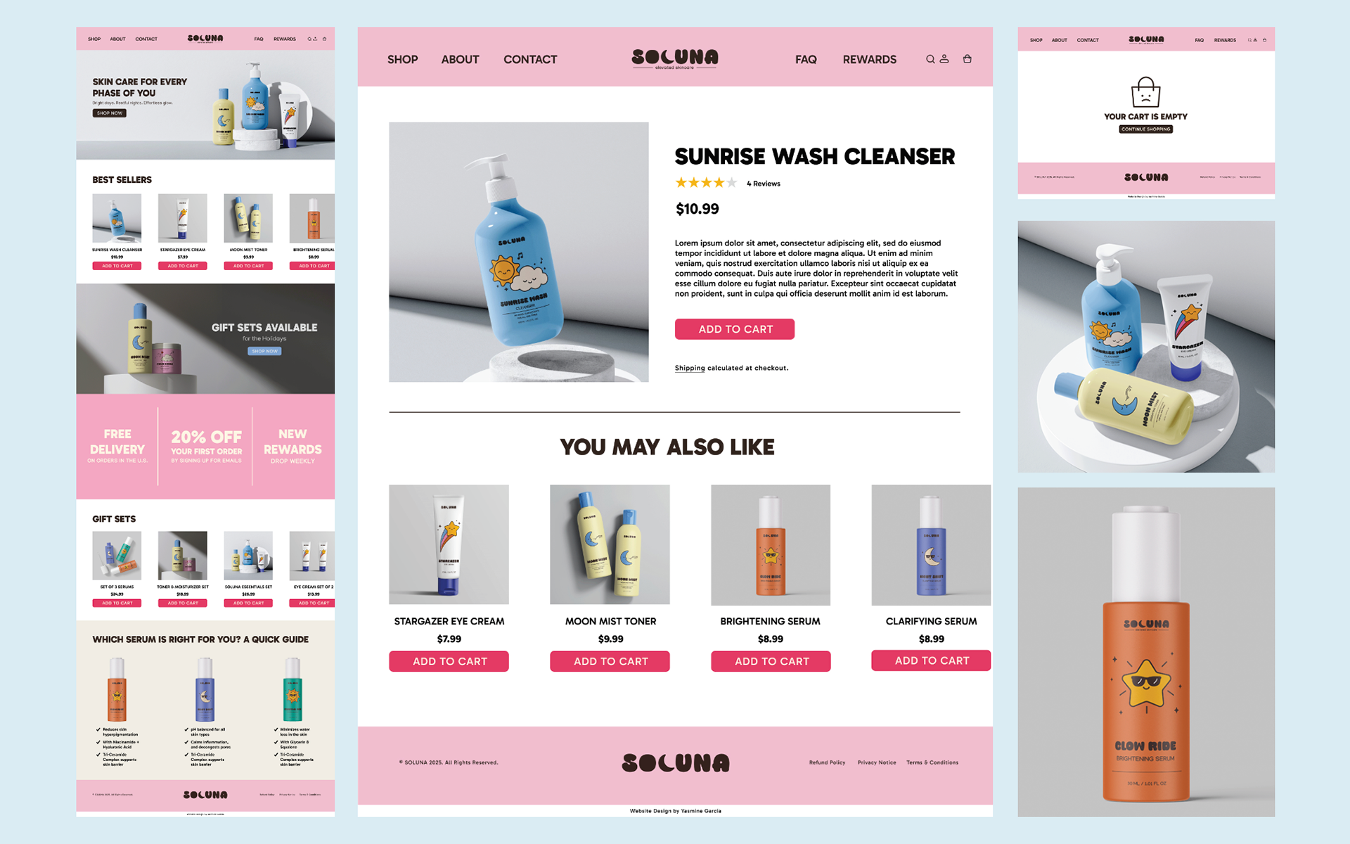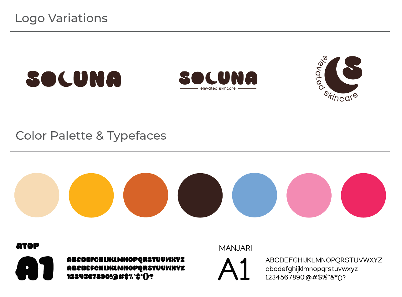 Overview: A skincare brand identity inspired by the balance of sun and moon, developed through full branding guidelines, packaging design, and a cohesive website experience. Solution: Created three logo concepts, developed product names and designed packaging for six products in Illustrator to go on the website. Utilized mockups and Figma to design a few layouts while incorporating interactive elements to simulate a realistic user experience.